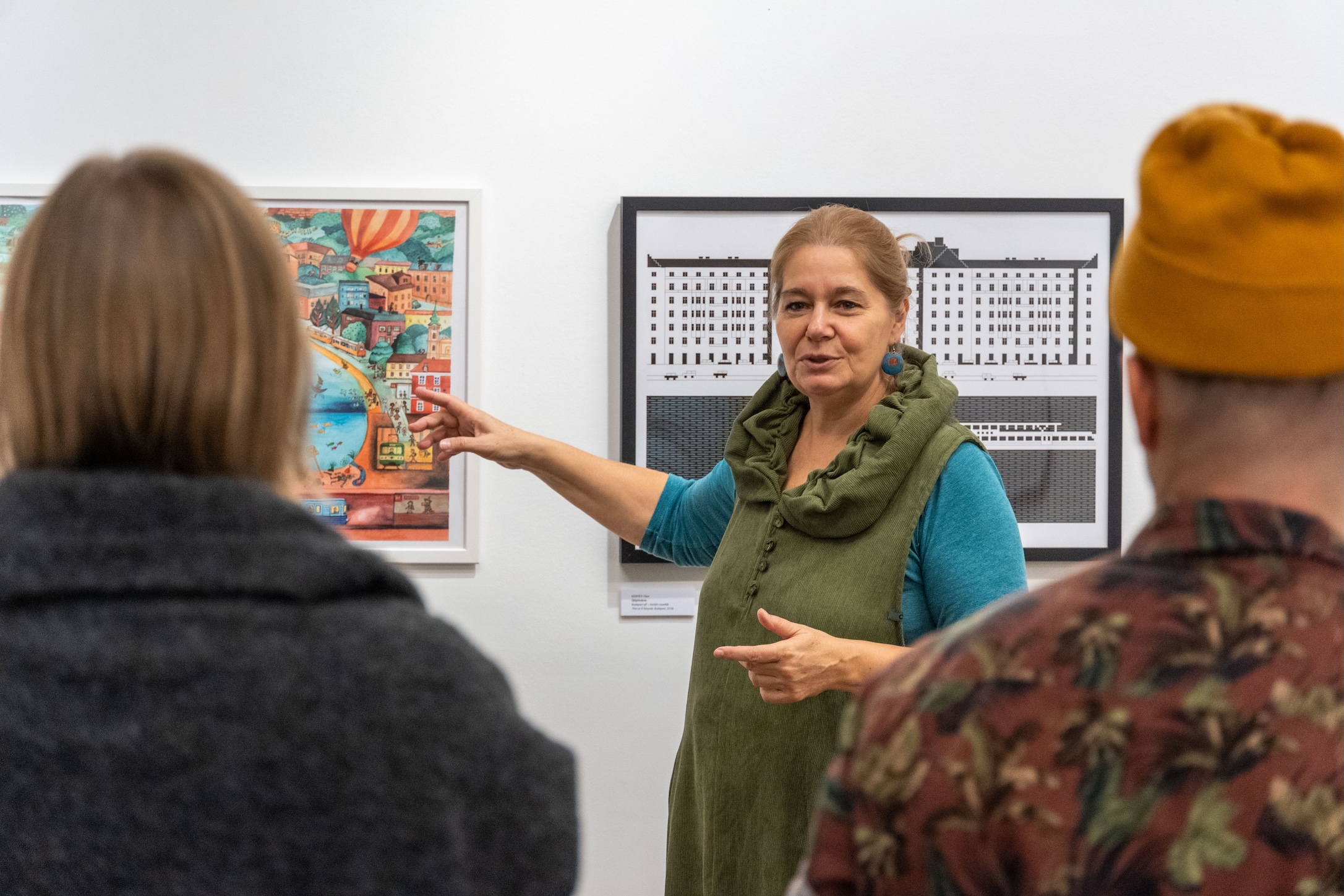 Révész Emese művészettörténész, a kiállítás kurátora tárlatvezetést tart (forrás: Deák17 Gyermek és Ifjúsági Művészeti Galéria)
