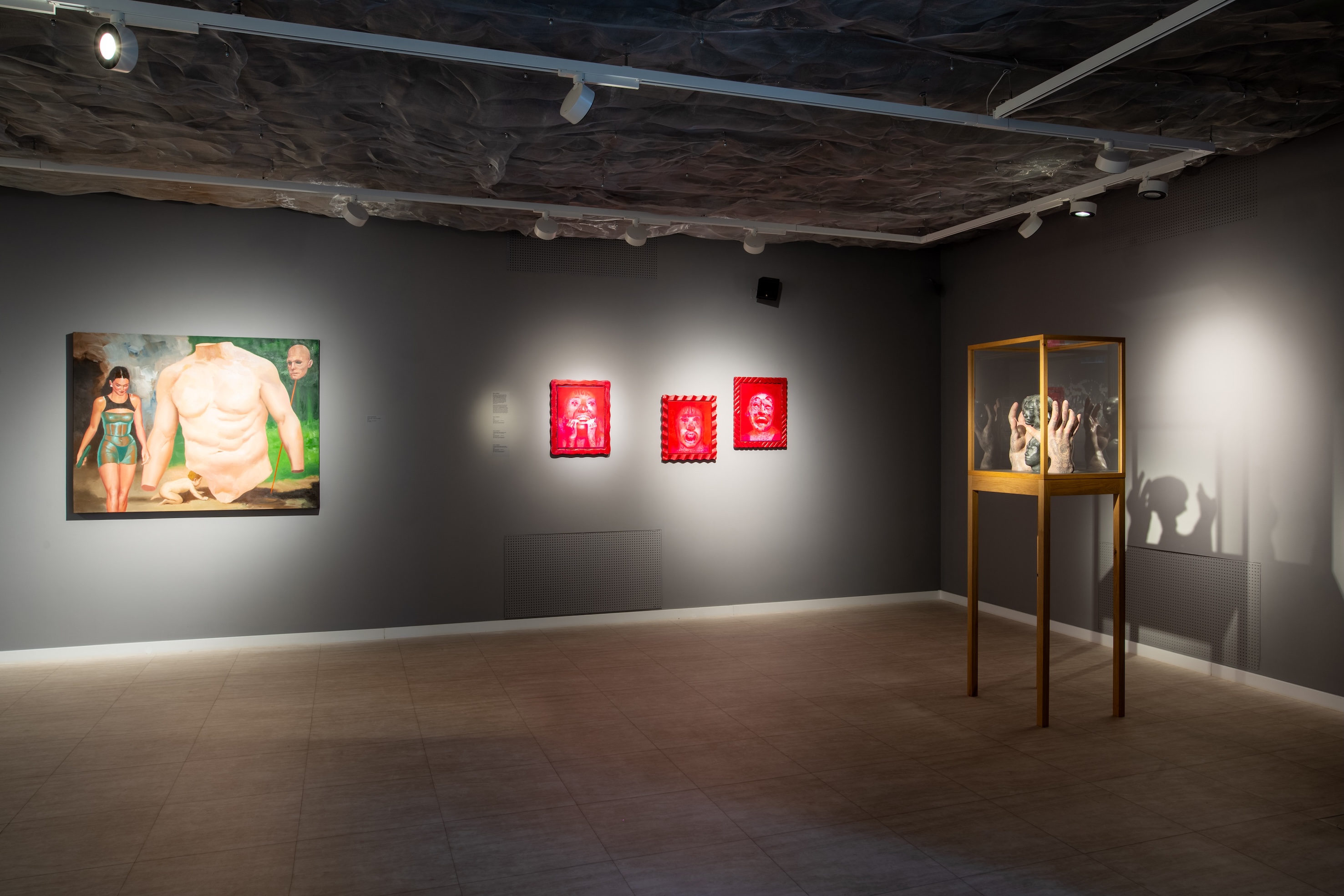 Részlet a Kitaposott ösvényen túl című kiállításból. A falon Mihael Milunović Álmaink teste című alkotása, mellette Martin Gerboc Dick, A Krisztus tekintetét álló ember portréja és A tulajdonságok nélküli ember portréja című művei, illetve Richard Stipl: Bolid című installációja (forrás: HAB)