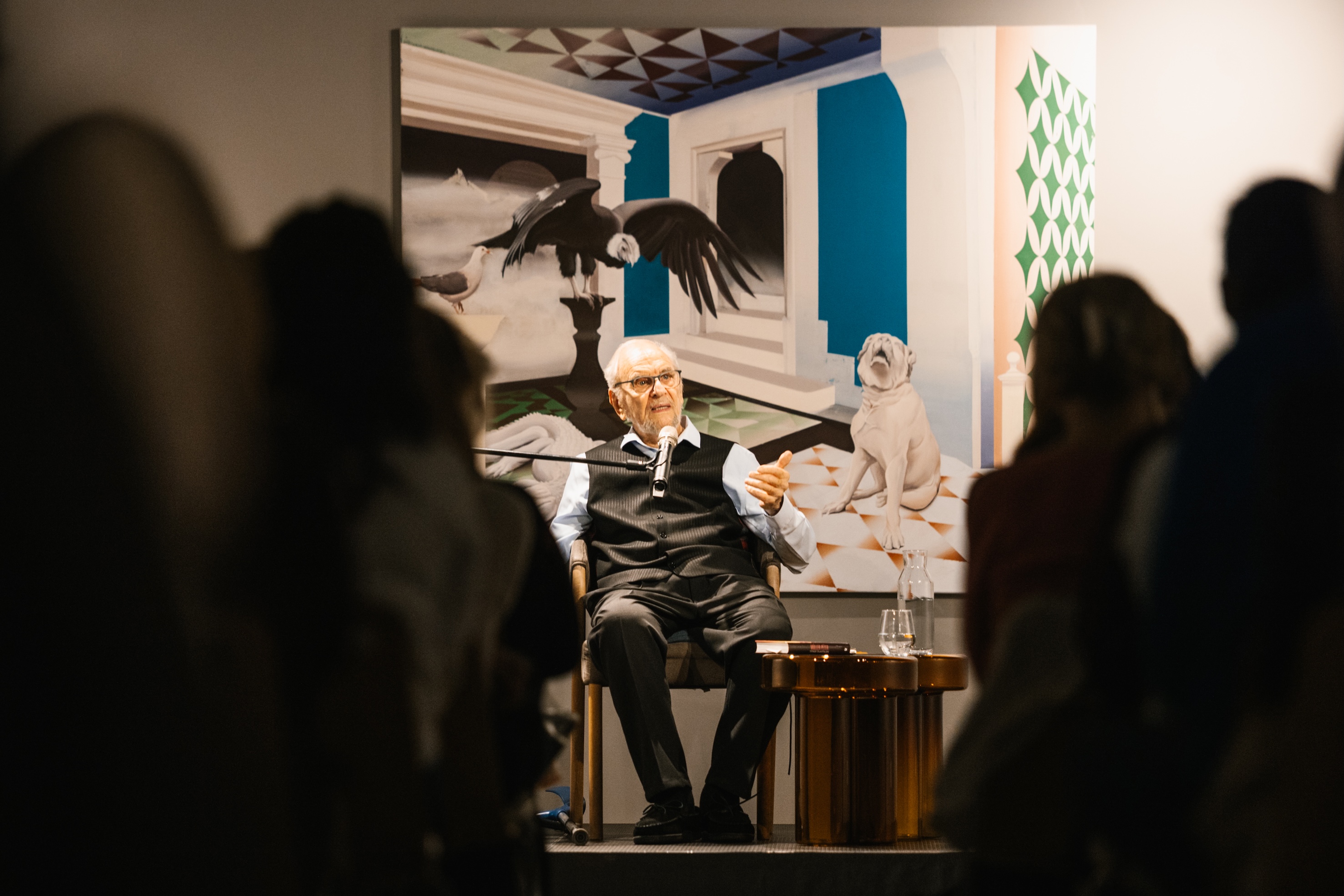 Müller Péter előadást tart a HAB-ban, mögötte Jina Park Jennings kutyája Csodaországban című alkotása (fotó: Komróczki Dia)