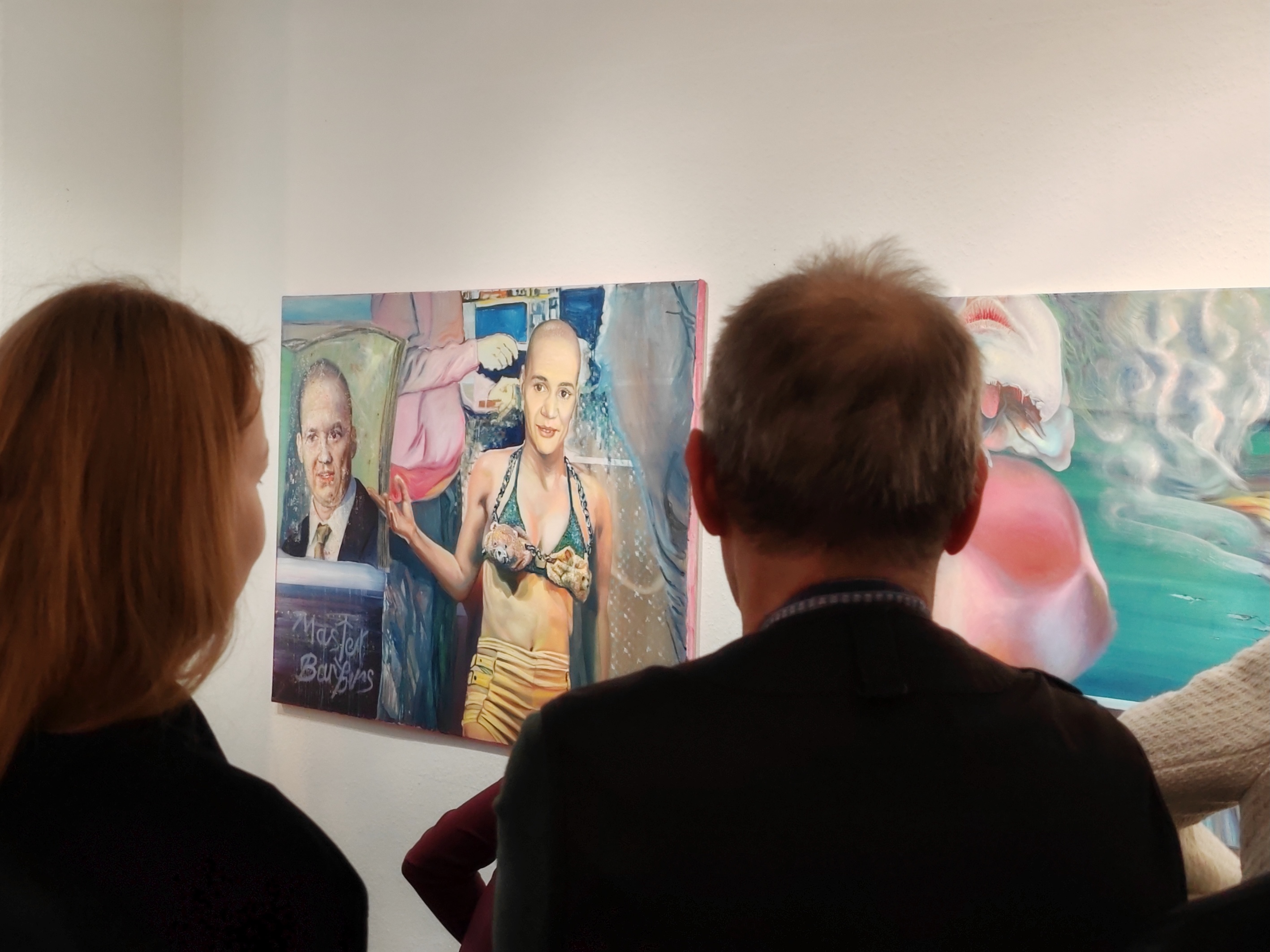 Részlet a kiállításból. A falon Békési Adrien Mester fodrászok és Másik szoba című alkotásai