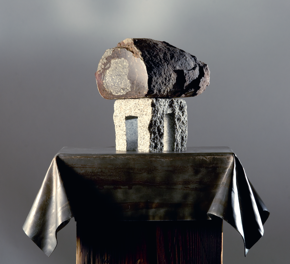 Az Áldozás Éva tulajdonában van, ez a munkám a kedvence. Fa lábazatra helyeztem egy kicsi, négyszögletes kőkockát, amely alá szerettem volna valamilyen terítőt tenni, de olyat, amely ellenáll a hidegnek és télen is kint maradhat a szabadban. Felfigyeltem rá, hogy lehet kapni annyira vékony ólomlemezt, amelyet úgy formálhatok, mintha valódi textília lenne. Elkészítettem, és nagyon otthonos hangulatot kapott az egész mű. A kicsi négyszögletes kockát kivágtam két irányból, így lett belőle asztal, négy lábbal. Végül egy Magyarországon talált vulkanikus kődarab került az installáció tetejére, amely mindkét végét kenyérre emlékeztető formára kicsiszoltam. Ezáltal oltárrá változott az alkotás.