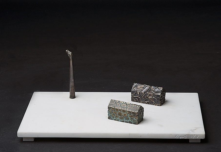 Nem célom megijeszteni, vagy sokkolni a nézőt, de szeretném elérni, hogy más nézőpontból is elgondolkodjon a látottakon. Emiatt választok hétköznapi tárgyakat munkáimban, amelyek valamilyen módon ismerősek, és a létezés kérdését járják körül. Például itt (az előtte fekvő katalógusban a Káin háza/Ábel háza című alkotására mutat) fehér márványlapon két apró barakkra emlékeztető épületet látunk: a bronz házikókat a különálló kémény egészíti ki, amelyből füst száll fel. Ezekkel a hétköznapi motívumokkal – ház, kémény, füst – a holokauszt traumáját szimbolizálom.