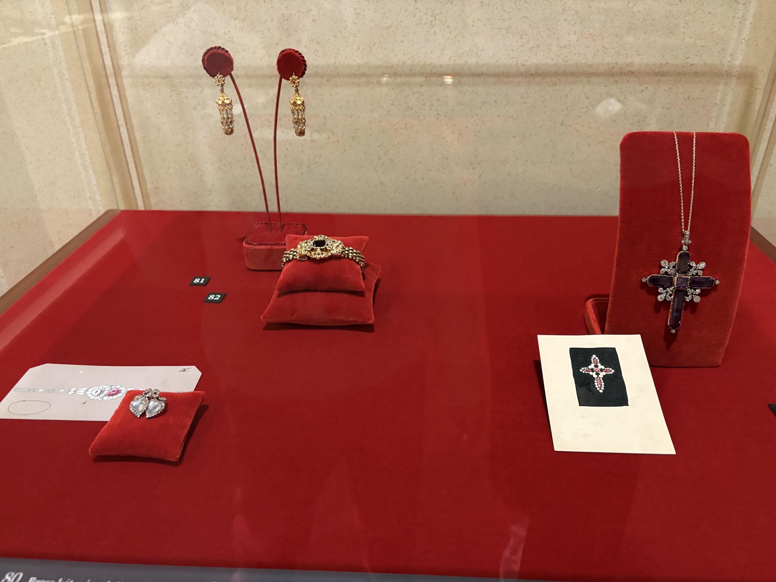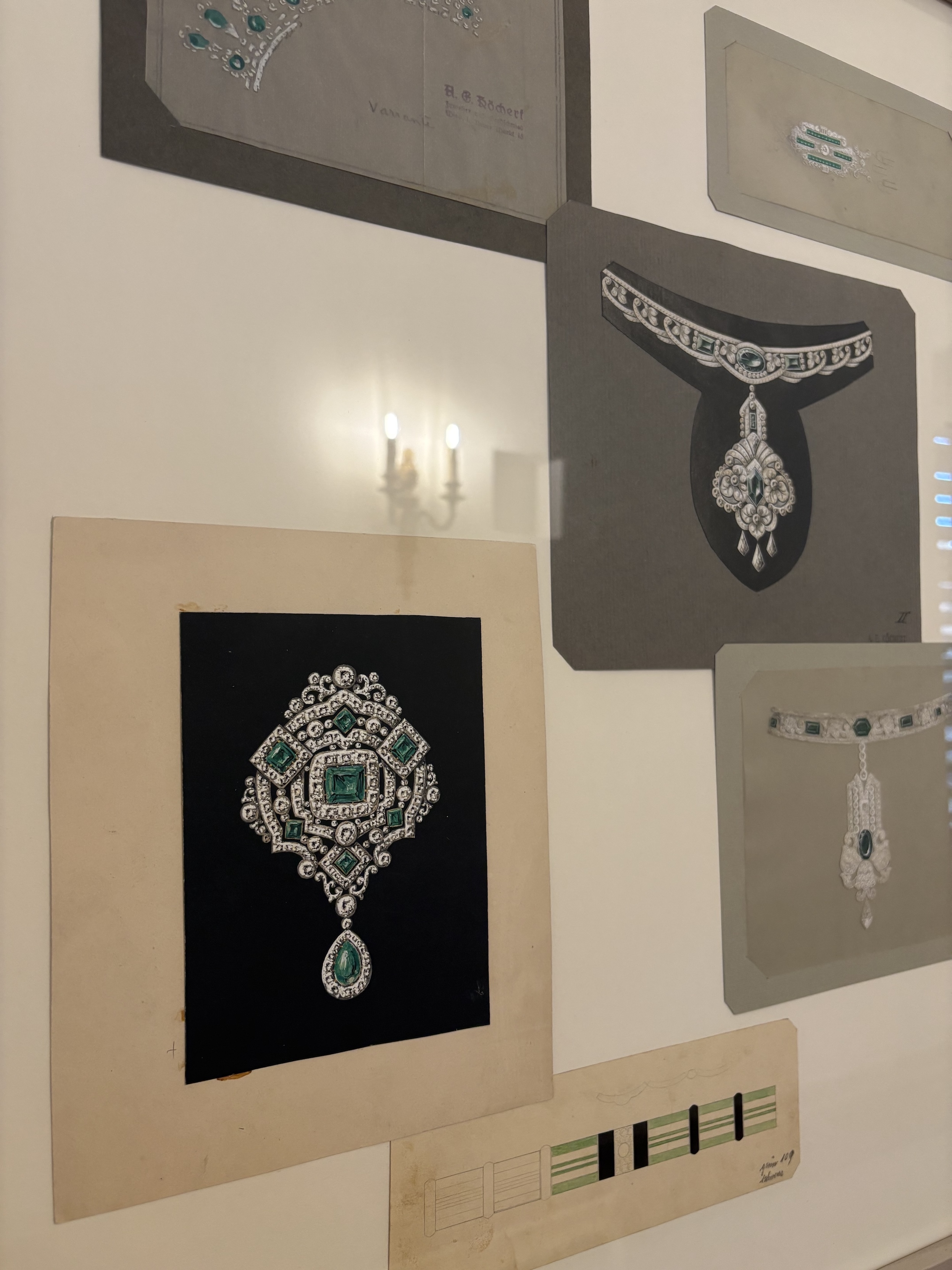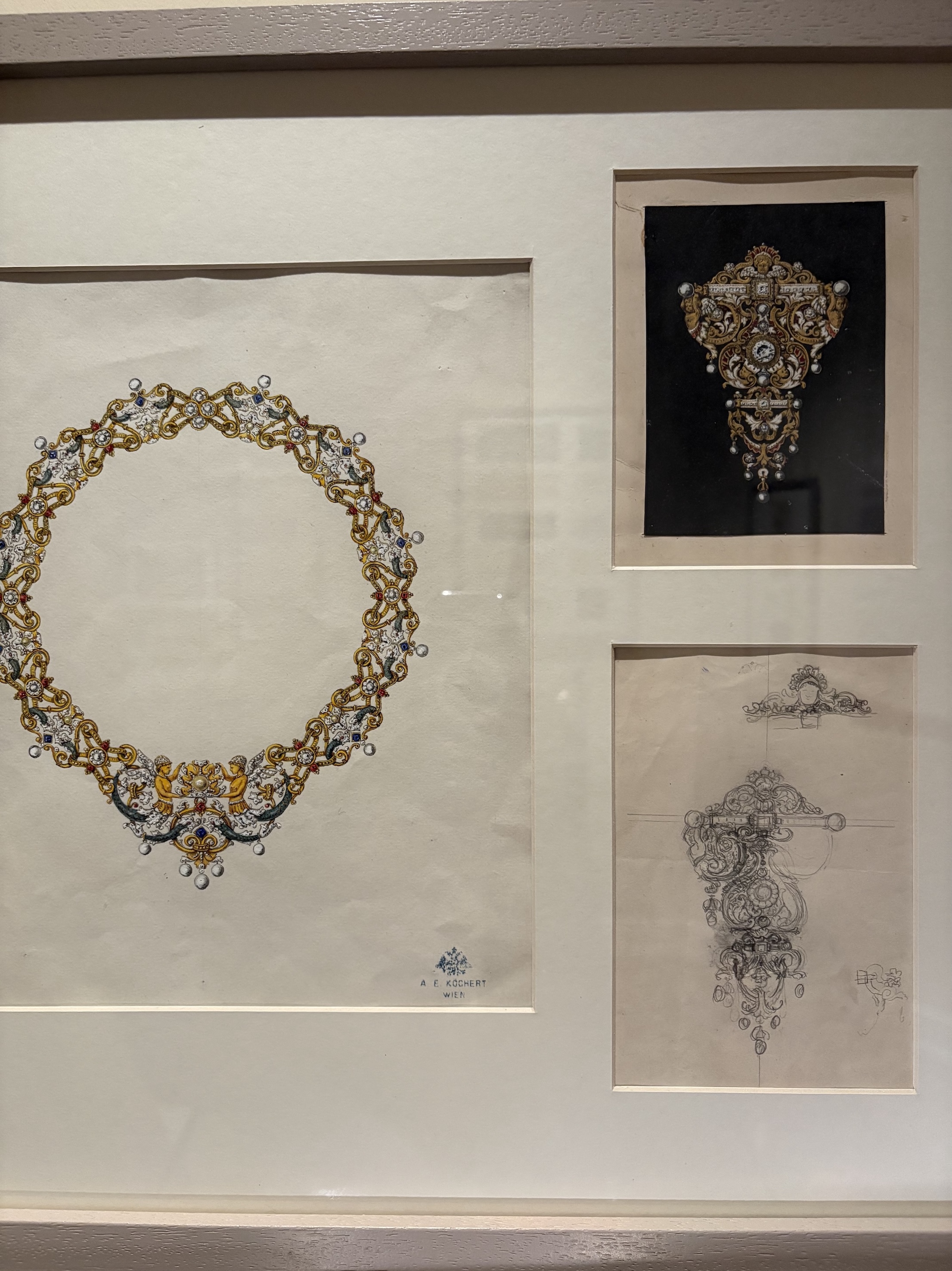 A műtárgyak között központi helyet foglal el a neoreneszánsz stílusú, gyémántokkal és zománccal díszített bross, amelyet a híres dán építész, Theophil von Hansen tervezett Erzsébet királynénak. Hansen neve ismerősen csenghet a bécsi építészet kedvelőinek, hiszen ő tervezte a Parlamentet és a Musikvereint is. Az ékszert évtizedeken át elveszettnek hitték, mígnem egy családi gyűjteményben tűnt fel újra. Most az eredeti tervrajzok kíséretében látható – tökéletes példájaként annak, hogyan fonódik össze az építészet, a formatervezés és az ötvösművészet a XIX. században.