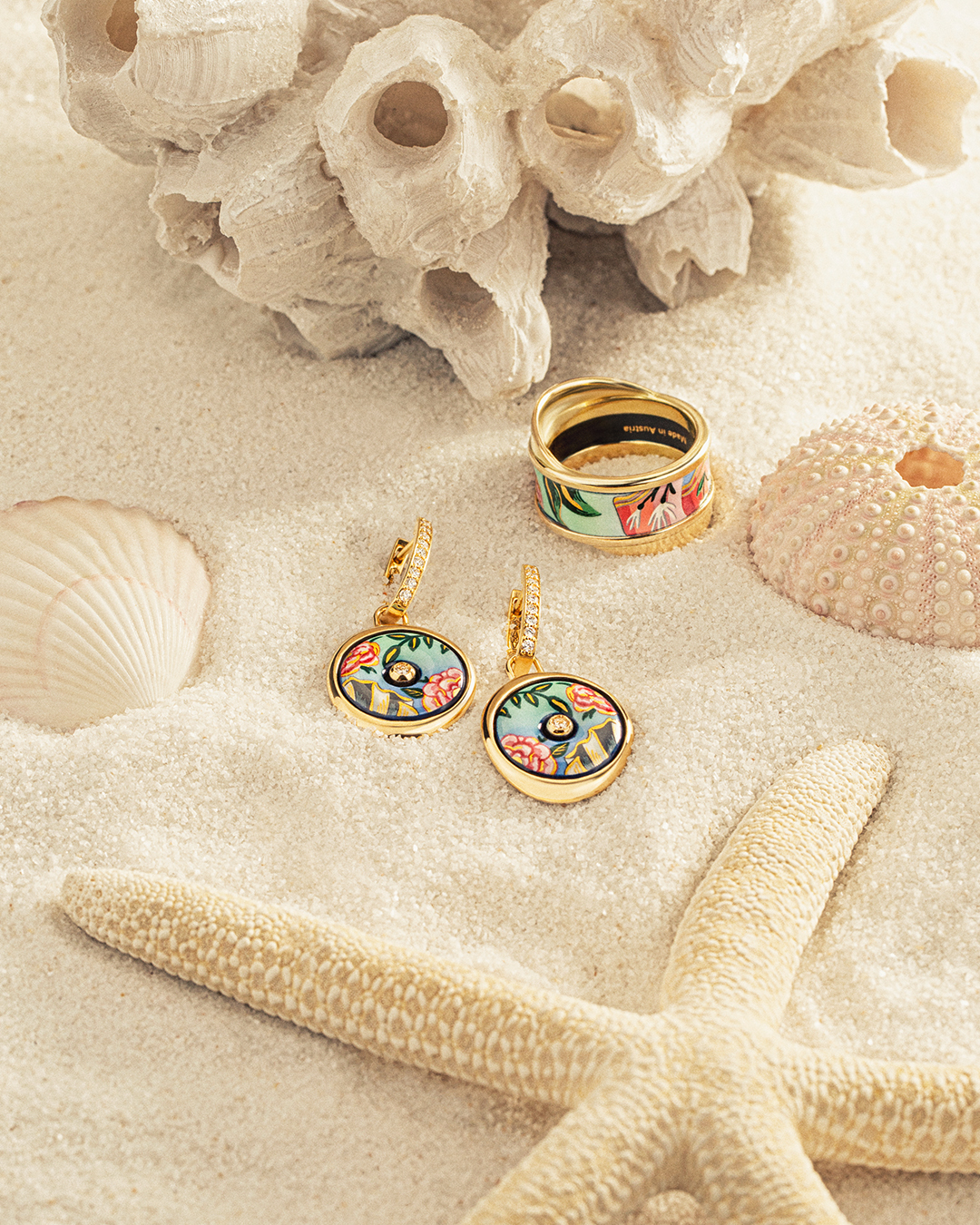 A FREYWILLE művészei a mű színeit és hangulatát tűzzománcon jelenítik meg: a kollekció ékszerein gyöngyházfényű árnyalatok, rózsaszín és halványkék tónusok egészülnek ki tengerzöld és türkiz színekkel, a mentazöldből világoskékbe hajló színátmenet a tenger és a horizont kontrasztjára utal. A huszonnégy karátos aranyporral készült díszítések a Botticelli-festmény aranyló részleteit idézik, luxusfényű és meleg hatást kölcsönözve a daraboknak.