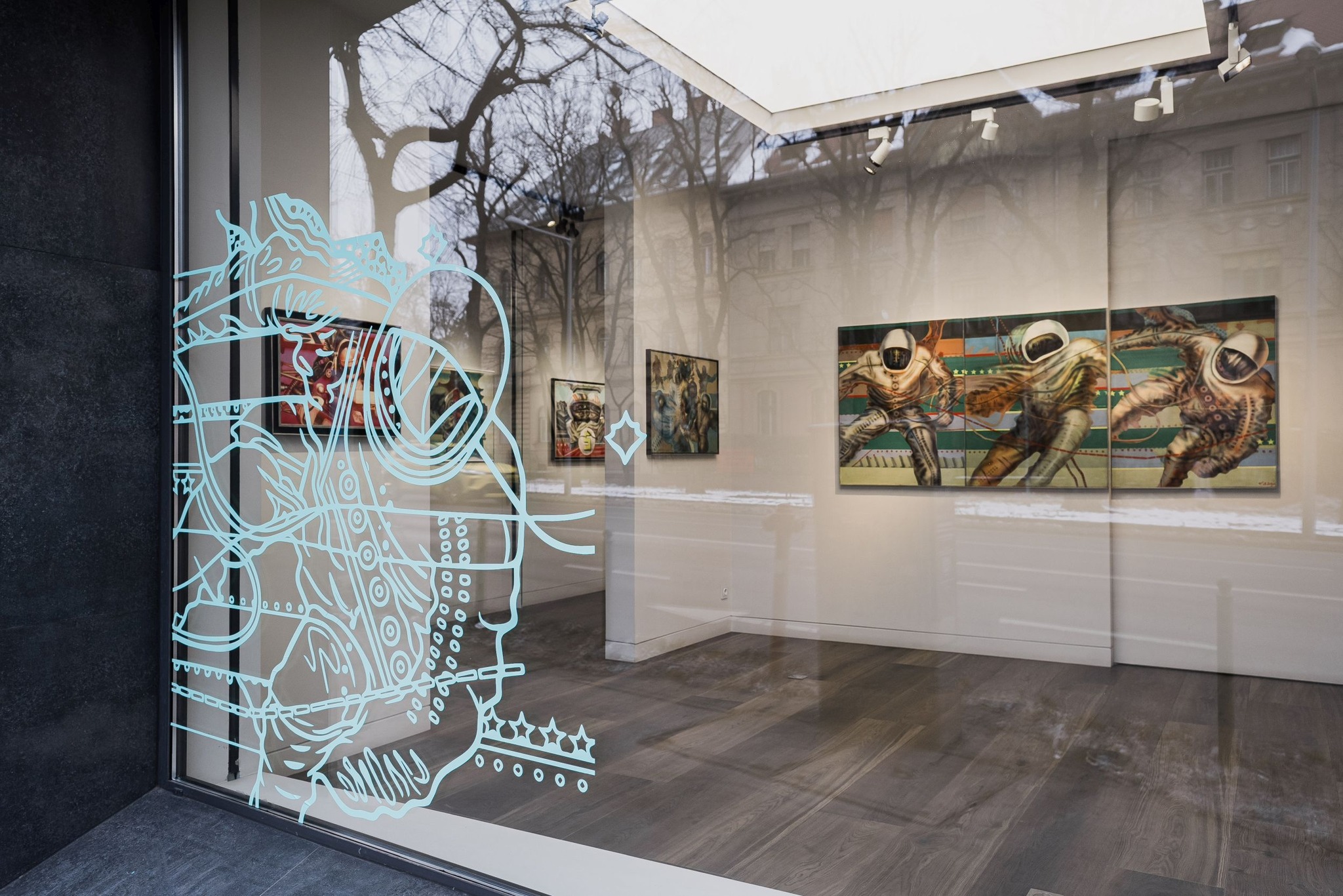 Részlet a kiállításból. A falon a művész Asztronauták című műve