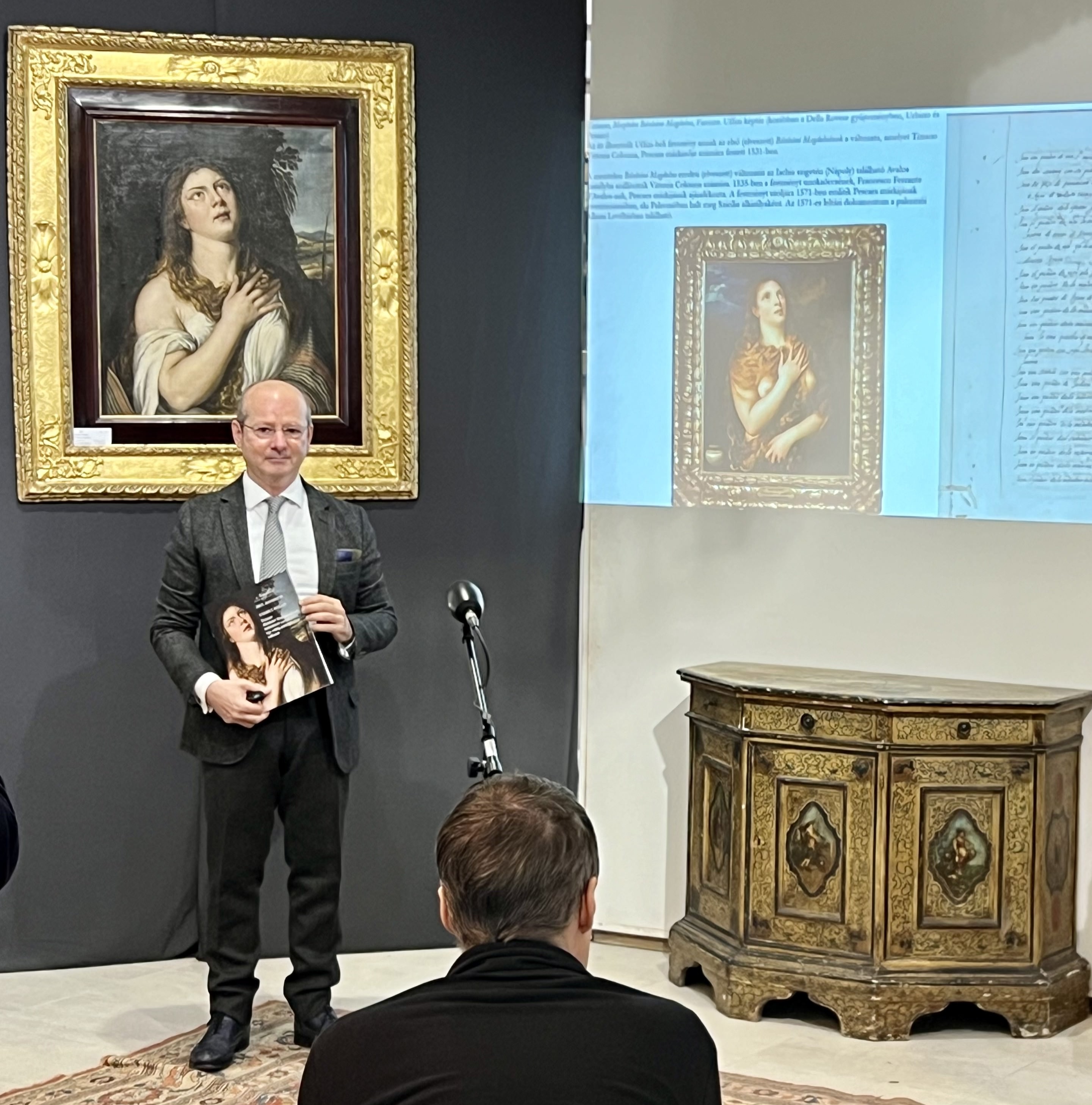 A velencei festészet legragyogóbb korszakát reprezentáló Tiziano a XVI. században többféle változatot készített Bűnbánó Magdolnáról – egy műkedvelőkből és a festő életében fontos személyekből álló közönségnek. Az itáliai reneszánsz neves olasz kutatójától, Andrea Donatitól a kiállítás megnyitójának sajtóeseményén megtudhattuk, hogy a szentről készített mű első változatát 1531 márciusa és áprilisa között festette meg. – A megbízás II. Federico Gonzaga-tól érkezett, amely megbízást Alfonso d’Avalos szorgalmazott Fabrizio Maramaldo közvetítésével. A festményt azonban eredetileg Pescara márkija özvegyének szánták – mondta.