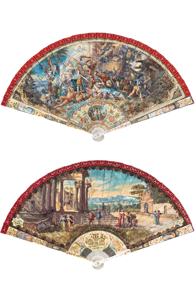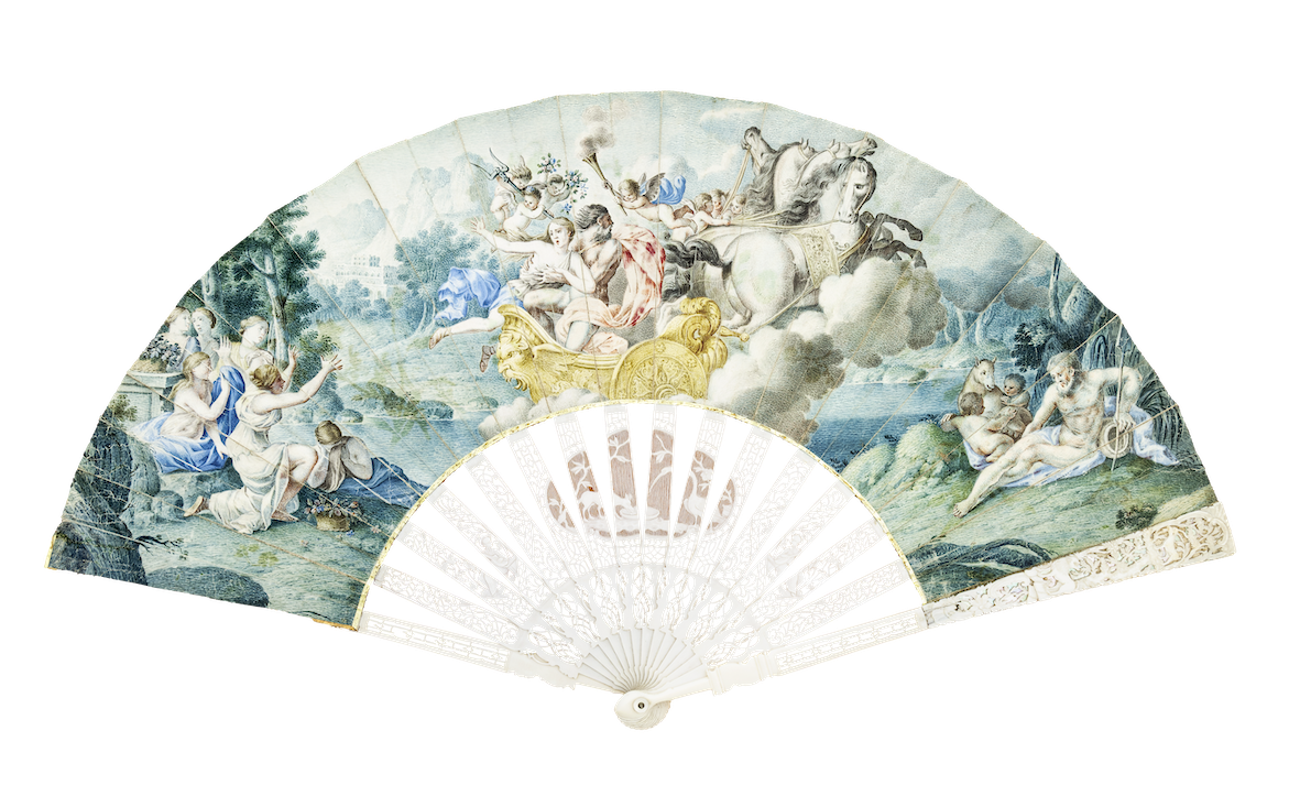 Proserpina elrablása (Faragott, áttört elefántcsontküllők, gyöngyházalátétes üvegstrassz rögzítőszegeccsel. Angol montírozású pergamenlegyező színes gouache festéssel. Itália, 1750 körül, 53,5 x 28,5 cm (forrás: BÁV ART)