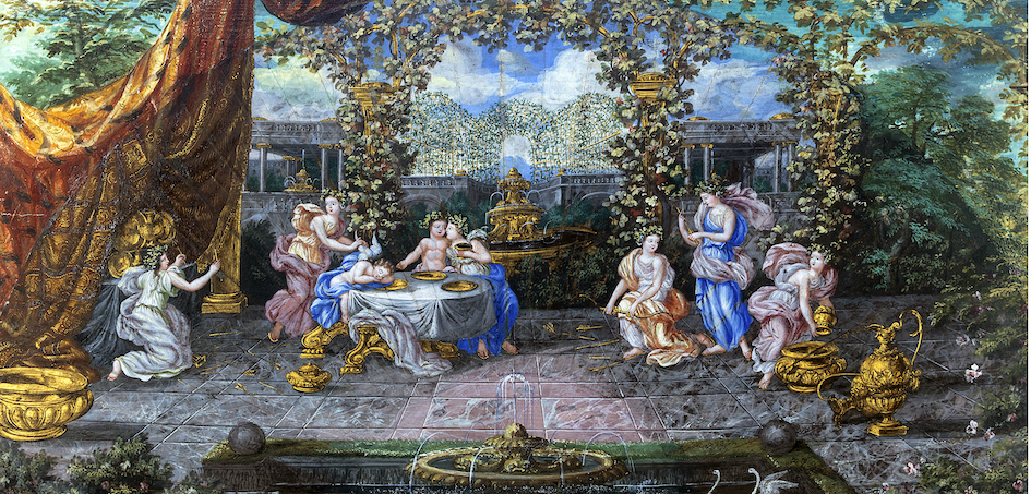 N. Z.: Venezuelából került hozzám egy 1710–20 körül, Franciaországban készült legyező, amelyet rendkívül szép kép díszít. Csak később, véletlenül derült ki, hogy az ábrázolás alapja a versailles-i kastély Tükörtermének boltozatán szerepel. A Charles Le Brun festette freskón – és így a legyezőn is – az Apolló alakjában megjelenő XIV. Lajost láthatjuk. Mellette az 1667–1668-as spanyol–francia háború során meghódított területeket szimbolizáló, térdet hajtó alakok kaptak helyet. Körülötte a mitológiából megismert istenek láthatóak.