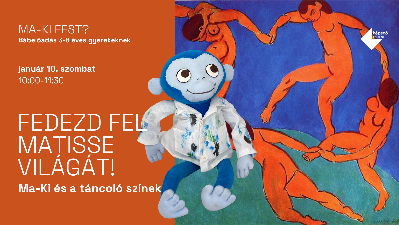 A KÉPEZŐ egyik védjegye a legfiatalabb korosztály megszólítása. A MA-KI fest? interaktív bábelőadás és alkotóprogram a három–nyolc éveseknek mutatja meg, hogy a festészet játék, történet és felfedezés is lehet. A kicsik aktív résztvevői az előadásnak, amelyhez közös alkotás is kapcsolódik.
