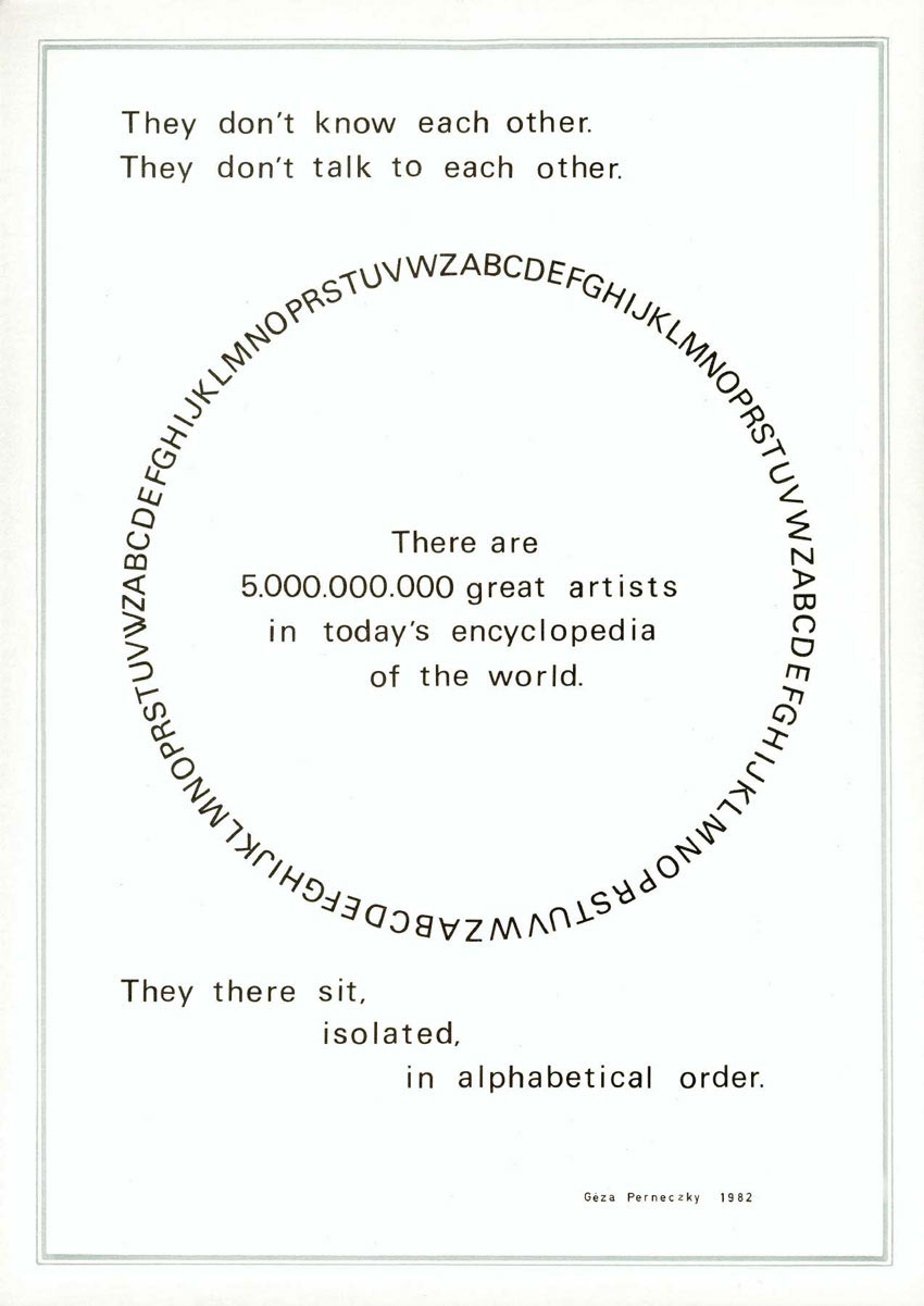 A kiállítás alapötletét Perneczky Géza egyik 1982-es konceptuális munkája, az Isolated adta, amely egy nyomtatott, angol nyelvű szöveg, papíron, múzeumi üveg alatt, és így hangzik pontosan: „5.000.000.000 művész neve szerepel a világ enciklopédiájában, ABC-sorrendben ülnek egymás mellett és mégsem ismerik egymást.” A jelenleg a pozsonyi Július Koller Society tulajdonában lévő munkát nemrégiben az acb Galériában állították ki, ott találkoztam vele először. Valószínűleg a legtöbb látogató átsiklott felette, mégis, amikor az Instagramon megosztottam a róla készült fotót, rengeteg külföldi barátom érdeklődött a mű eredetéről, és izgalmas volt látni, hogy az 1980-as években készült alkotás mennyire erősen hat ma is. Számomra ennek a konceptuális munkának az az üzenete, hogy itt van rengeteg paralel történet, alkotó, irányvonal, amelyekben néha visszatérő témák vannak, néha nem, és ezek az emberek eléldegélnek egymás mellett, pedig néha jó ránézni az alkotásaikra úgy, hogy együtt szemléljük őket.