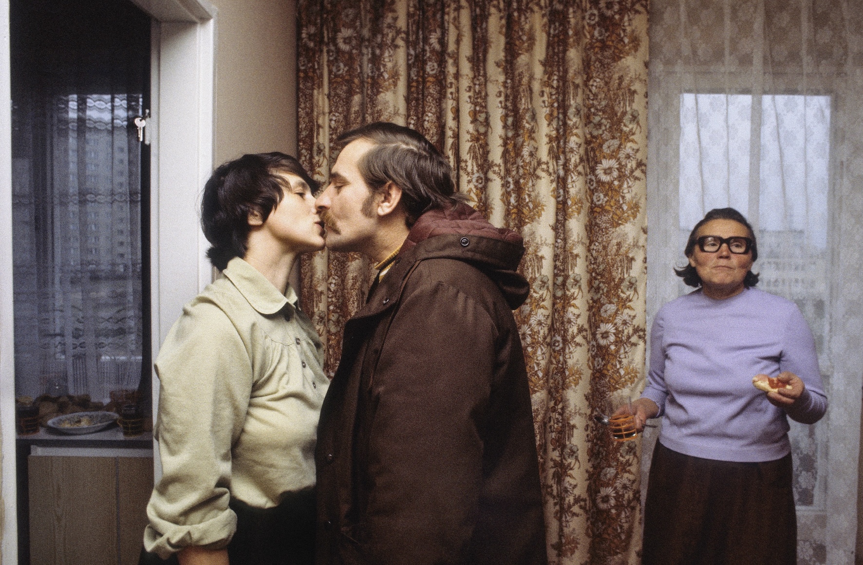 Gdańsk, 1980 novembere. Lech Wałęsa búcsúzik feleségétől, Danutától, mielőtt dolgozni indul a Szolidaritás Független Szakszervezet wrzeszczi irodájába. Jobbra Danuta Wałęsa édesanyja, Feliksa Gołoś (fotó: Chris Niedenthal)