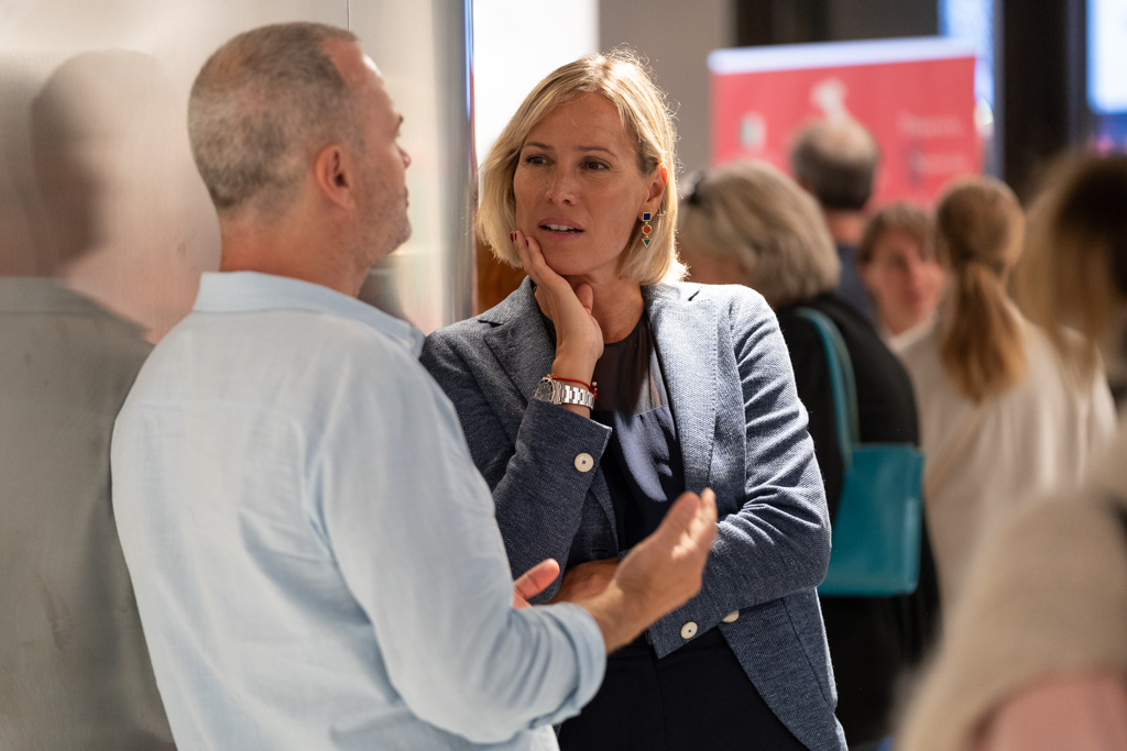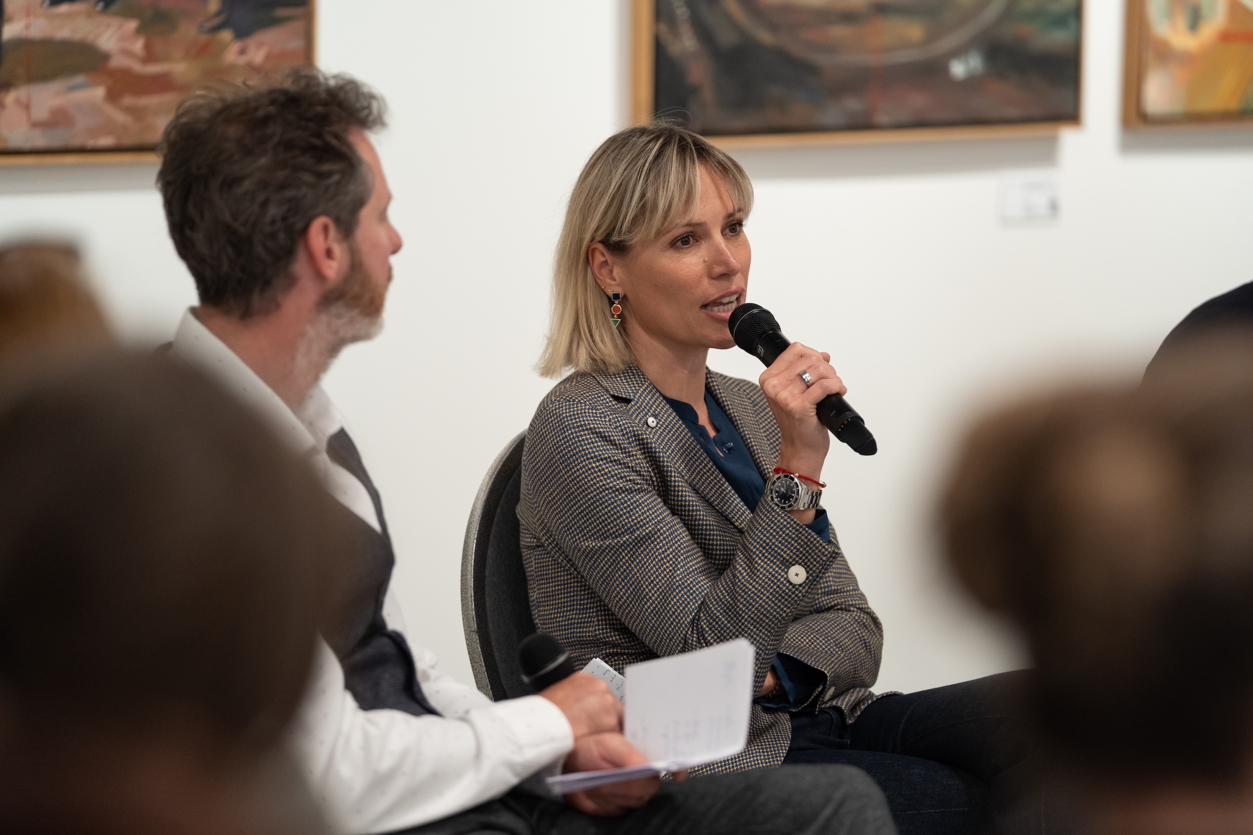Andreides Katalin az Art is Business Connections eseményén, amely kerekasztal-beszélgetésén a résztvevők a családi magángyűjtemények továbbörökítéséről mondták el tapasztalataikat. Mellette Tóth Pál Sándor gyűjteménykezelő, a beszélgetés moderátora (fotó: Pixolar Photography)