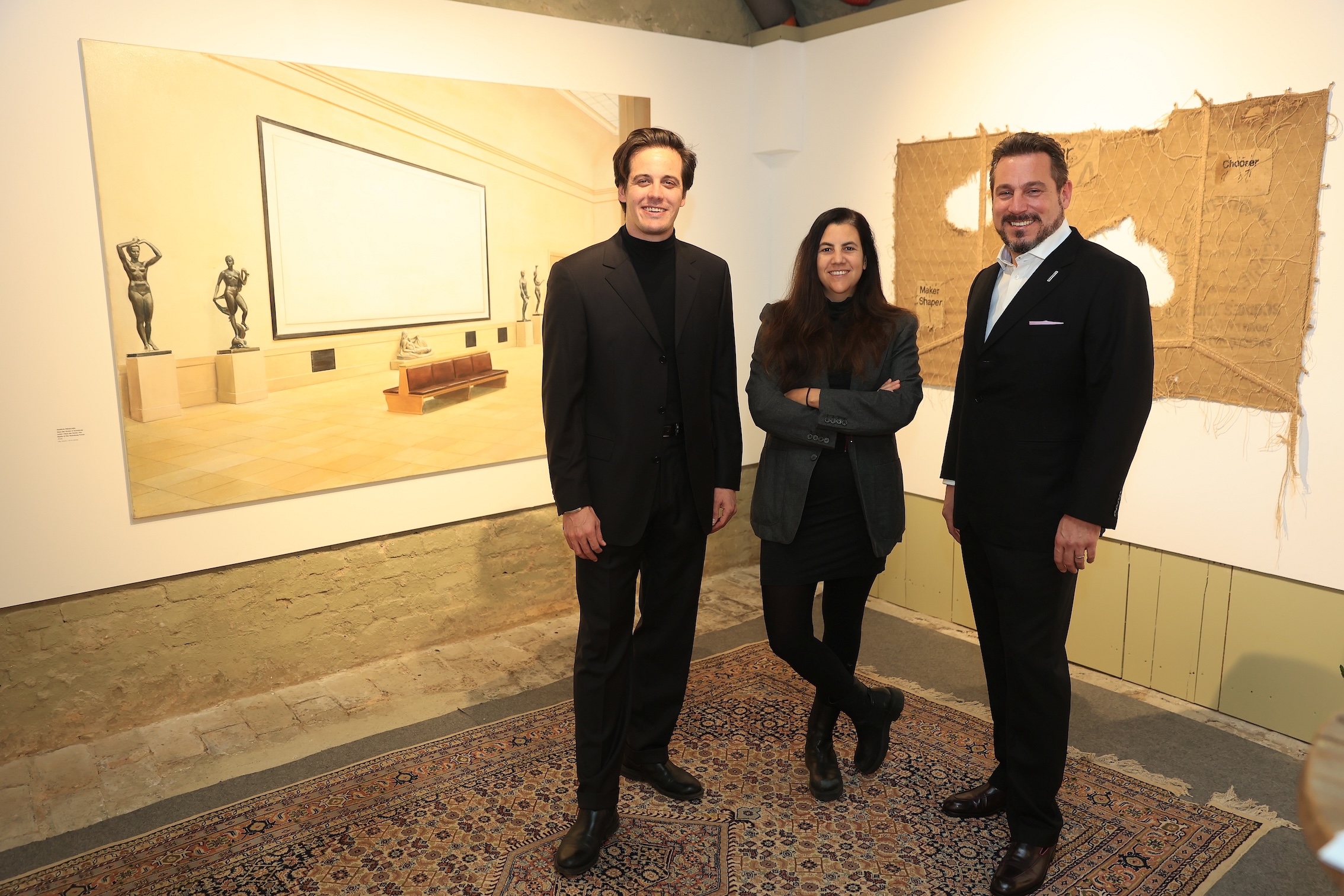 Török Krisztián Gábor, Az átláthatatlanság zónái című kiállítás kurátora, Vanessa Bersis és Sebastian Haselsteiner. A falon Markus Proschek, Haus der Kunst: A teutoburgi csata, 2006, olaj, vászon, 150 x 220 cm és Birke Gorm, Hátsó szándékok (tyúkanyó), 2021, zsákvászon, alumínium, polipropilén fonal 110 x 160 cm című művek (fotó: Sárközy Mariann)