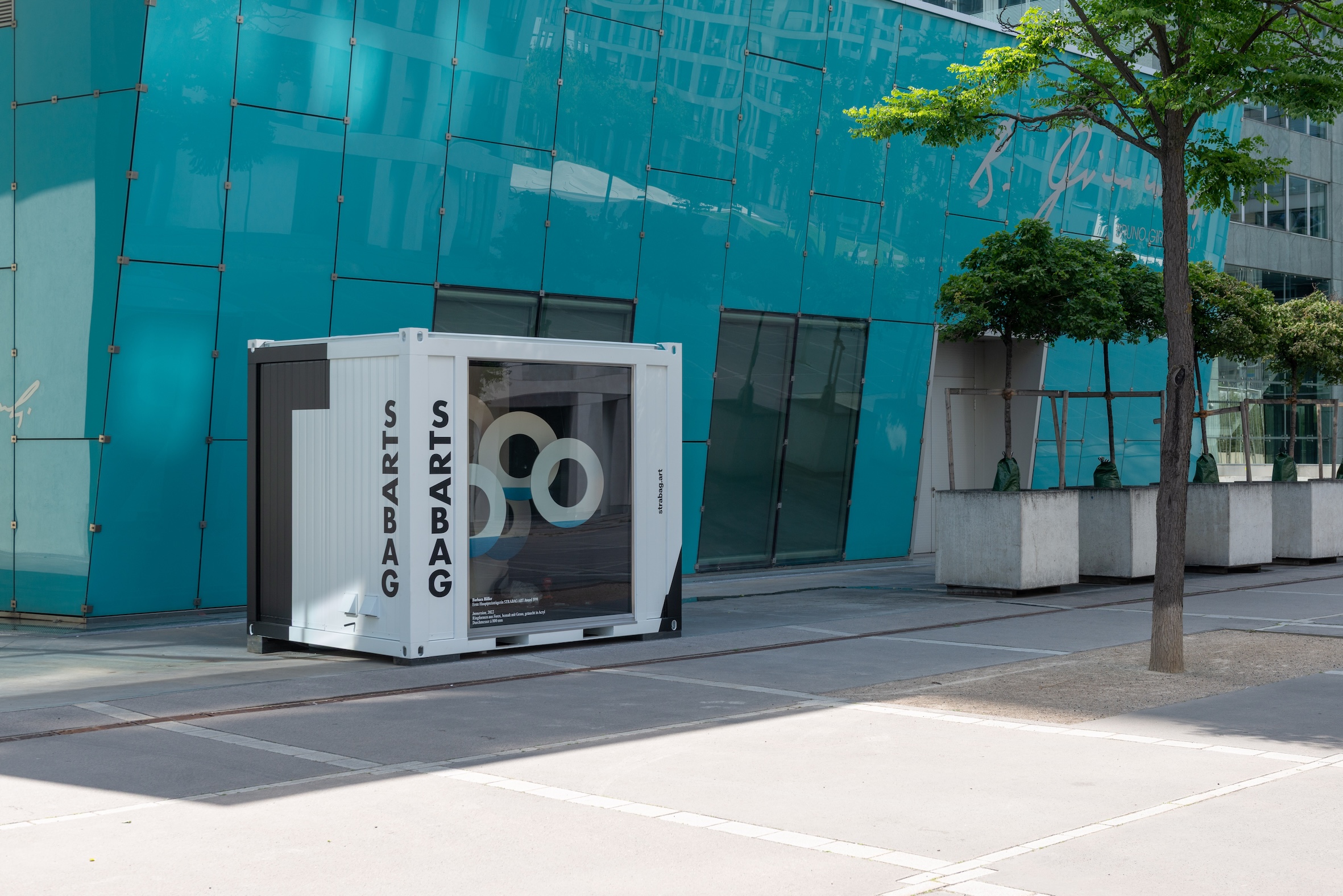 STRABAG ART konténer a cég bécsi székháza előtt, rajta az 1999-ben díjazott Barbara Höller munkájával (fotó: Rudi Froese)