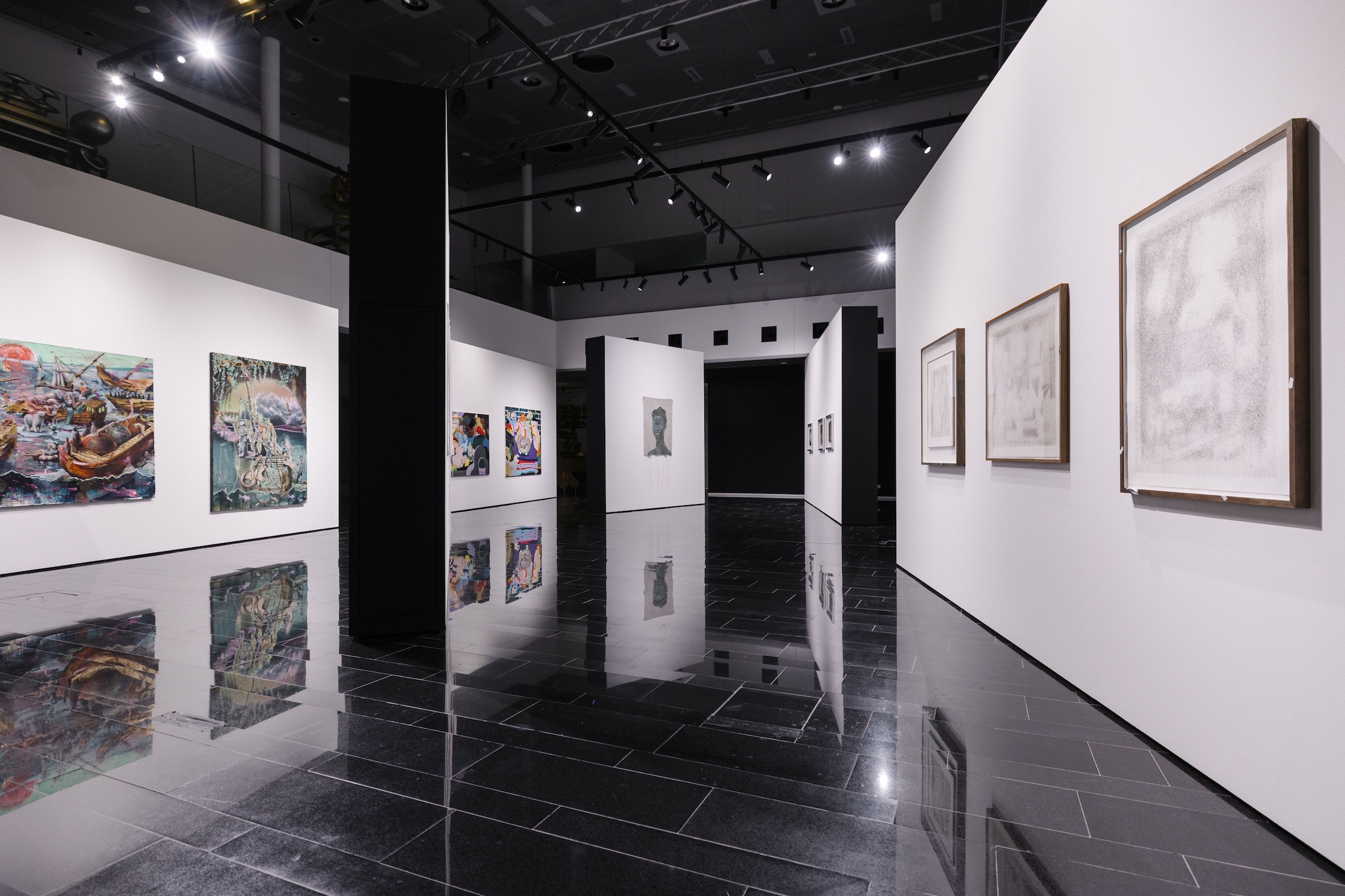 Nyitókép: Részlet Az Átláthatatlanság zónái című kiállításból. A kiállított művek (balról jobbra): Catherine Biocca: Marines V, 2019, ipari marker, PVC, 130 x 170 cm; Czene Márta, Az ügyfél, 2011, akril, olaj, farostlemez, 117 x 216 cm és Markus Proschek, Haus der Kunst: A teutoburgi csata, 2006, olaj, vászon, 150 x 220 cm (fotó: Sárközy Mariann)