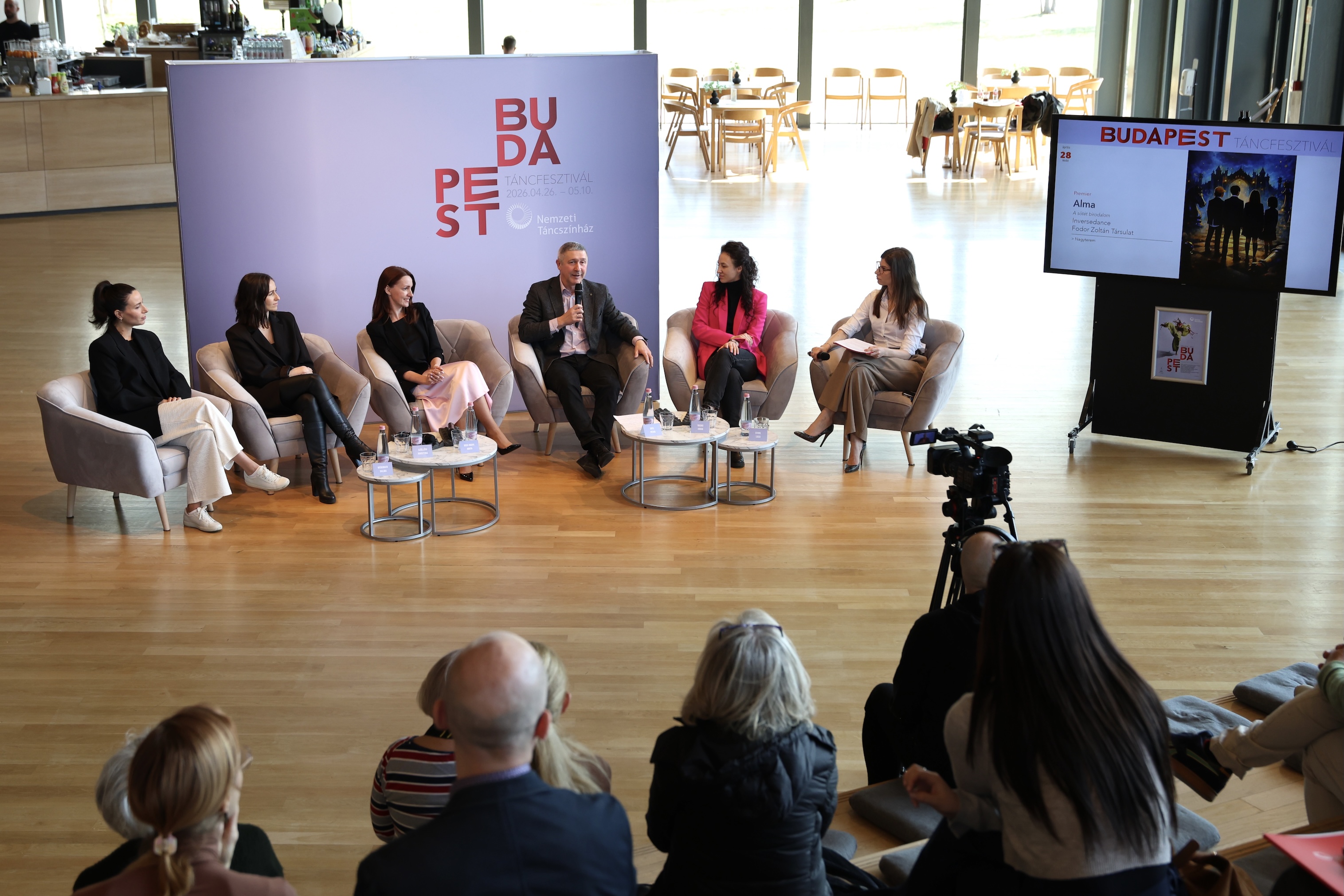 A Budapest Táncfesztivál sajtótájékoztatója. A résztvevők (balról jobbra): Wéninger Dalma táncművész, koreográfus, Szőllősi Kriszta táncművész, koreográfus, Kiss-Hegyi Anita, a Kulturális és Innovációs Minisztérium államtitkára, Ertl Péter, Nemzeti Táncszínház igazgatója, Vasas Erika táncművész, koreográfus és Stohl Luca műsorvezető (fotó: Kaszner Nikolett)