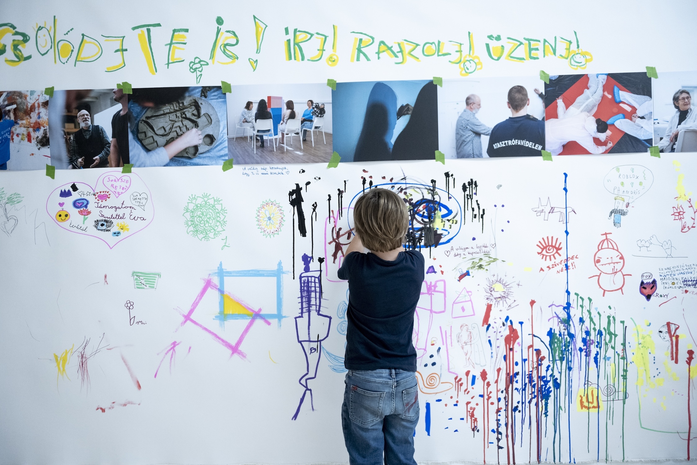 Üzenőfal a Világszép Alapítvány Világszép kapcsolódások című kiállításán (fotó: Fotó: Glódi Balázs, Ludwig Múzeum)