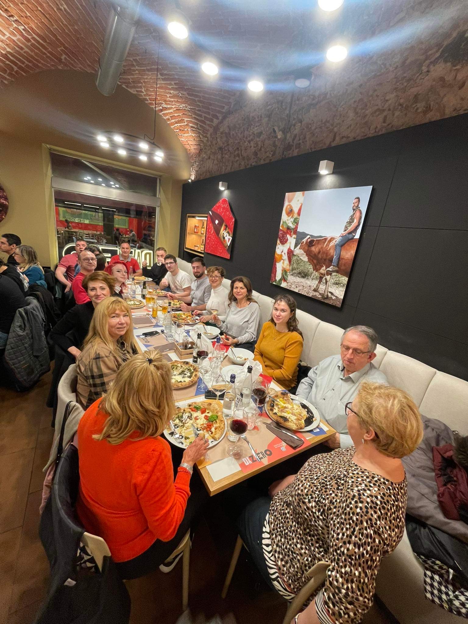 Amíg az alkotók próbálnak, a támotatói kör tagjai közös vacsorán vesznek részt egy hangulatos trattoriában, 2023-ban Torinóban (forrás: Sipos Szilvia)