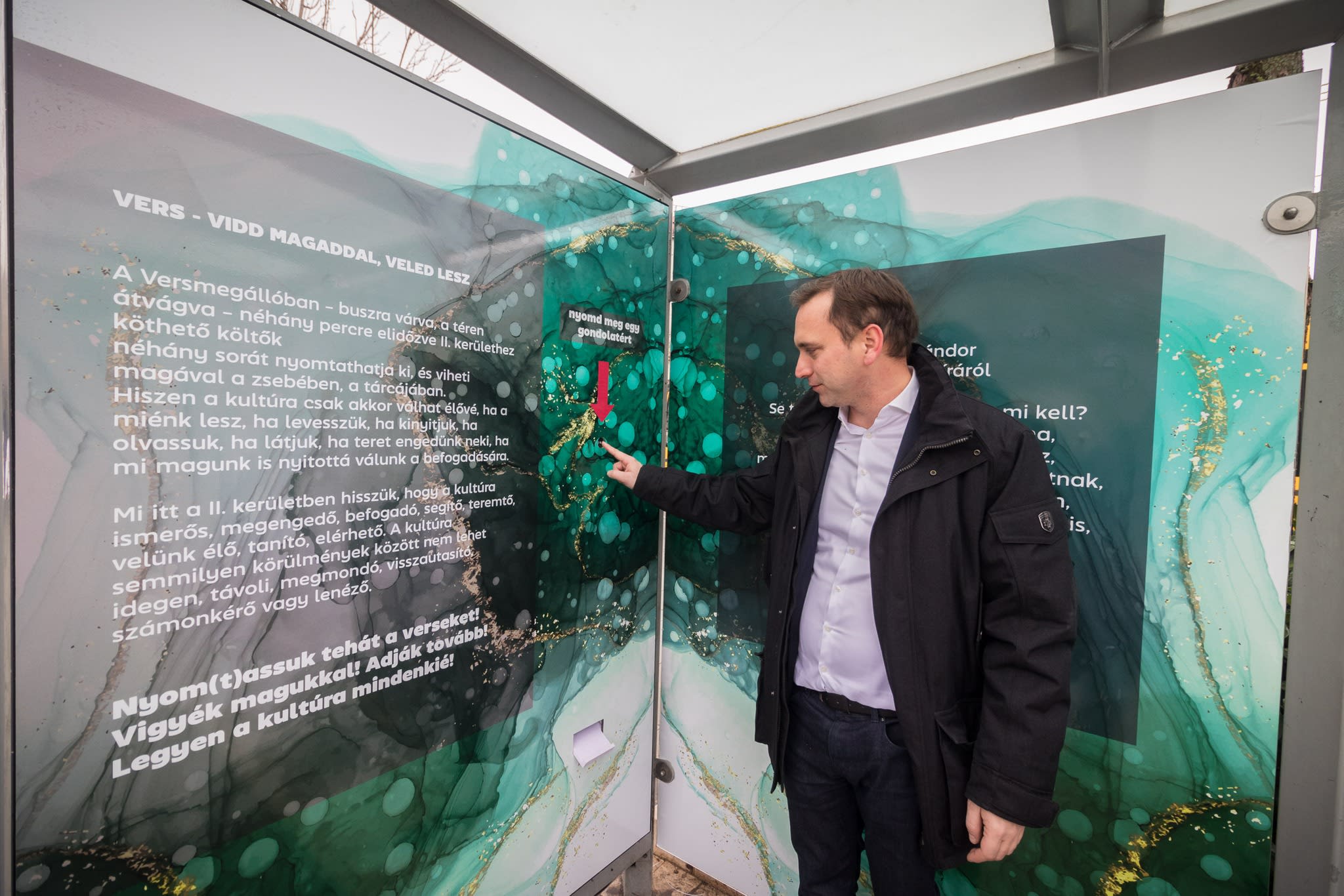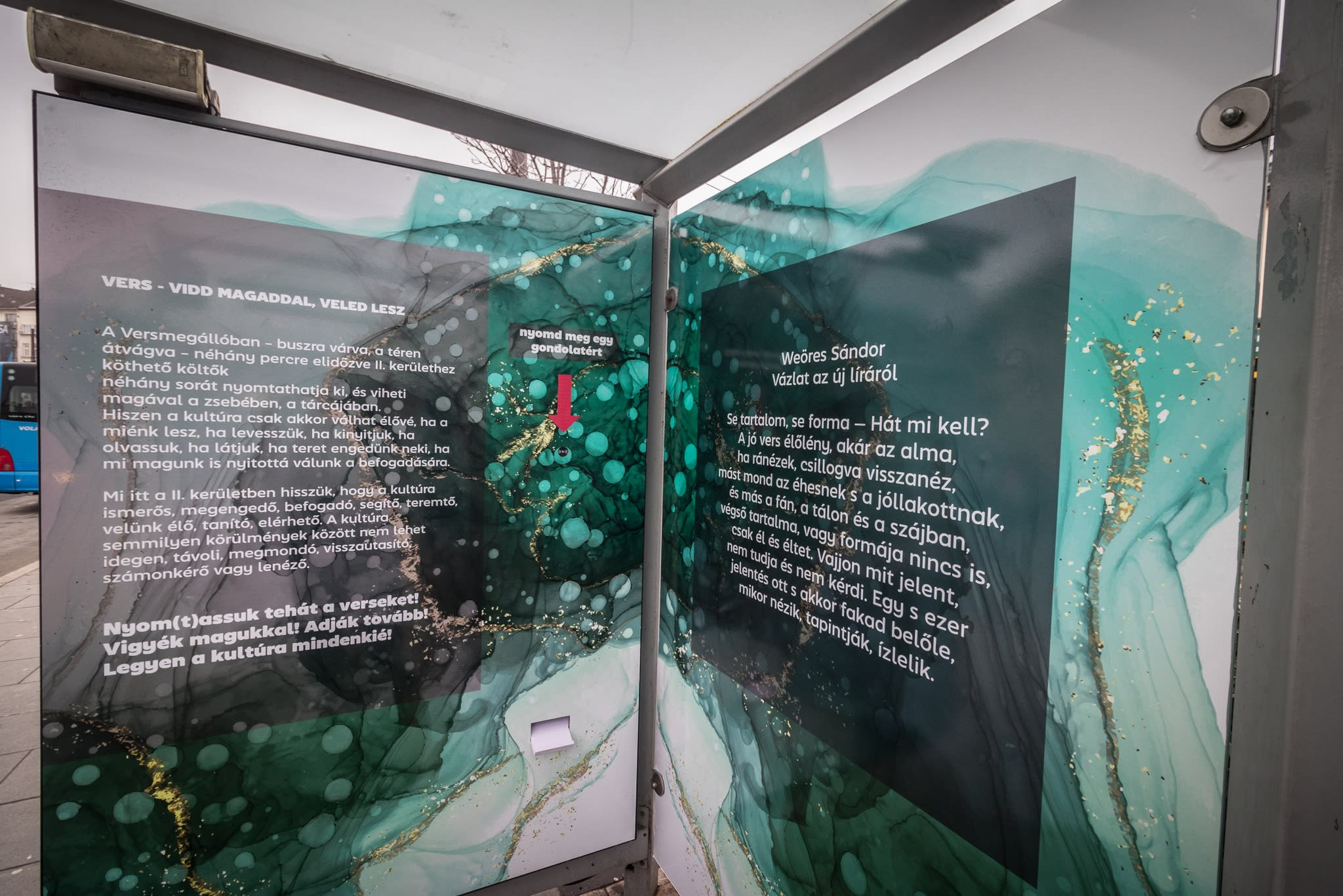 „A versmegállóban akár buszra várva, akár a téren áthaladva a II. kerülethez köthető költők néhány sorát nyomtathatják ki, és vihetik magukkal zsebükben, tárcájukban. Meggyőződésünk, hogy a kultúra akkor válik élővé, ha a miénk lesz, ha olvassuk, ha látjuk, ha teret engedünk neki, és mi magunk is nyitottá válunk az alkotások befogadására. A II. kerületben hisszük, hogy a kultúra ismerős, megengedő, befogadó, segítő, teremtő, velünk élő, tanító, elérhető. A kultúra semmilyen körülmények között nem lehet távoli, idegen, megmondó, visszautasító vagy lenéző.